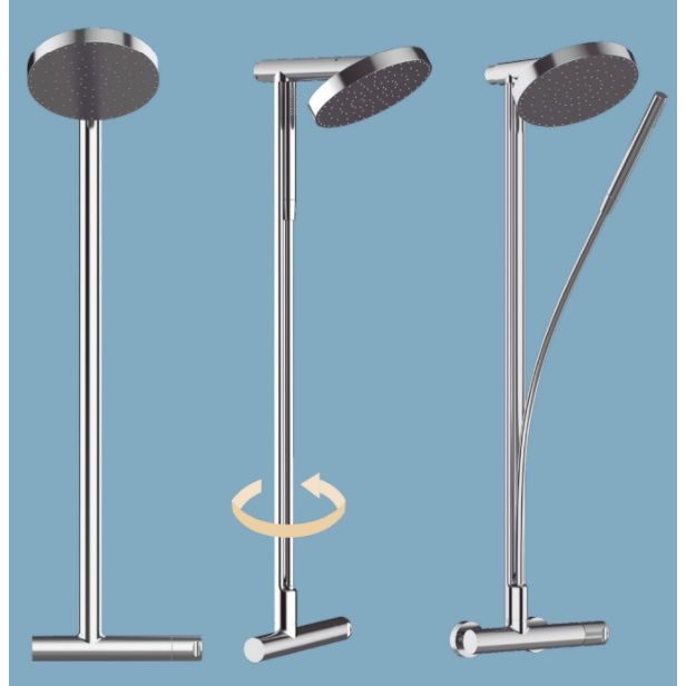Regendouche wandgarnituur Aura mat zwart met thermostatische douchekraan voorzien van een geïntegreerde omstelregeling, hoofddouche ø30cm en in het design verwerkte handdouche.