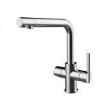 Keukenkraan Pure chroom met een filterinstallatie, deze kraan is voorzien van een dubbele uitloop waarvan één voor het gefilterde water en één voor het normaal stromende water. Het meegeleverde filter wordt geplaatst in de keukenkast, neemt weinig ruimte